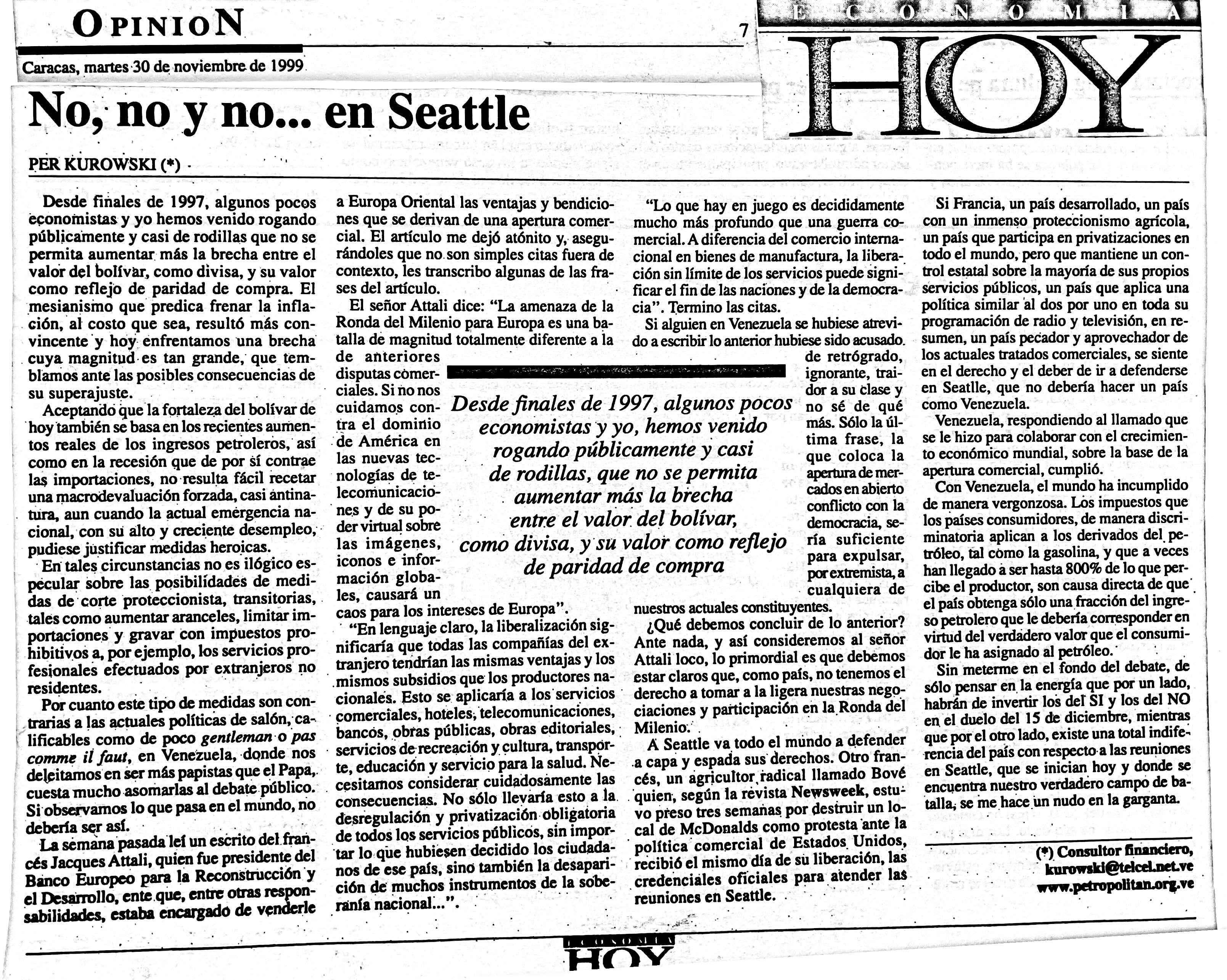 Si Francia, un país desarrollado, un país con un inmenso proteccionismo agrícola, un país que participa en privatizaciones en todo el mundo, pero que mantiene un control estatal sobre la mayoría de sus propios servicios públicos, un país que aplica una política similar al dos por uno en toda su programación de radio y televisión, en resumen, un país pecador y aprovechador de los actuales tratados comerciales, se siente en el derecho y el deber de ir a defenderse en Seattle, qué no debería hacer un país como Venezuela.